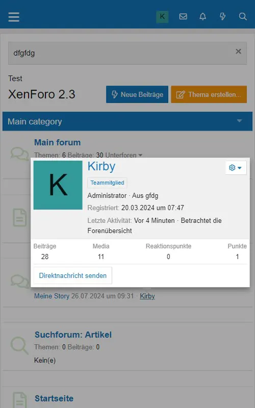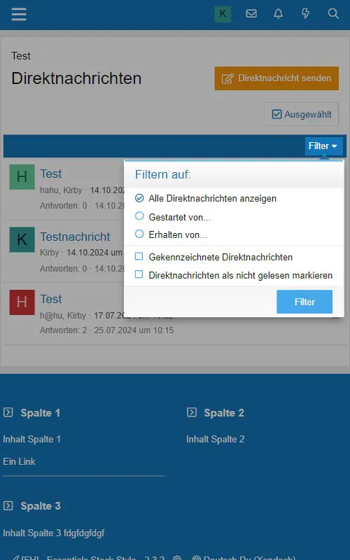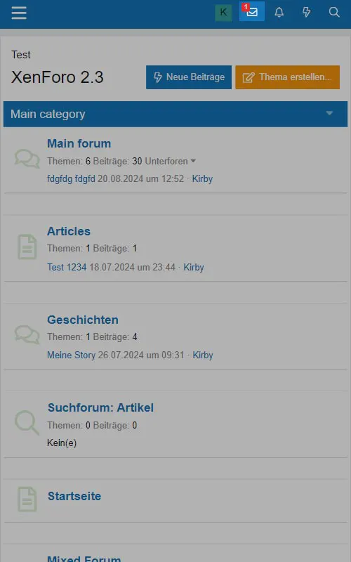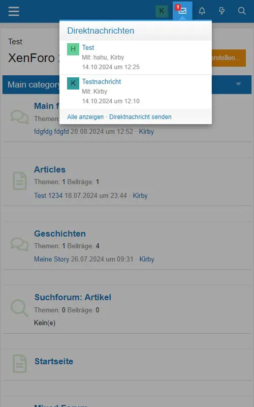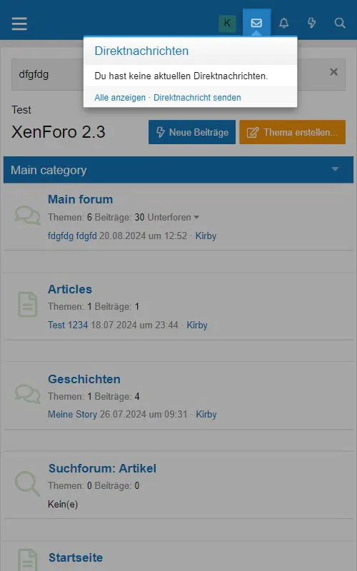 Im Gegensatz zum klassischen Nachrichtensystem stellt XenForo dem Benutzer ein deutlich leistungsfähigeres Direktnachrichtensystem zur Verfügung. Die Kopfzeile enthält einen Link zu den Direktnachrichten in Form eines Briefumschlags.