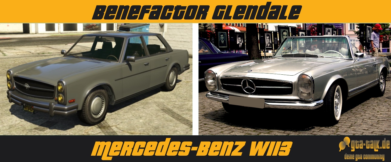 Schon ziemlich treffend alles, doch beim Benefactor Glendale würd ich eher auf diesen 4-Türer "Strich 8er" W114/W115/8 tippen
