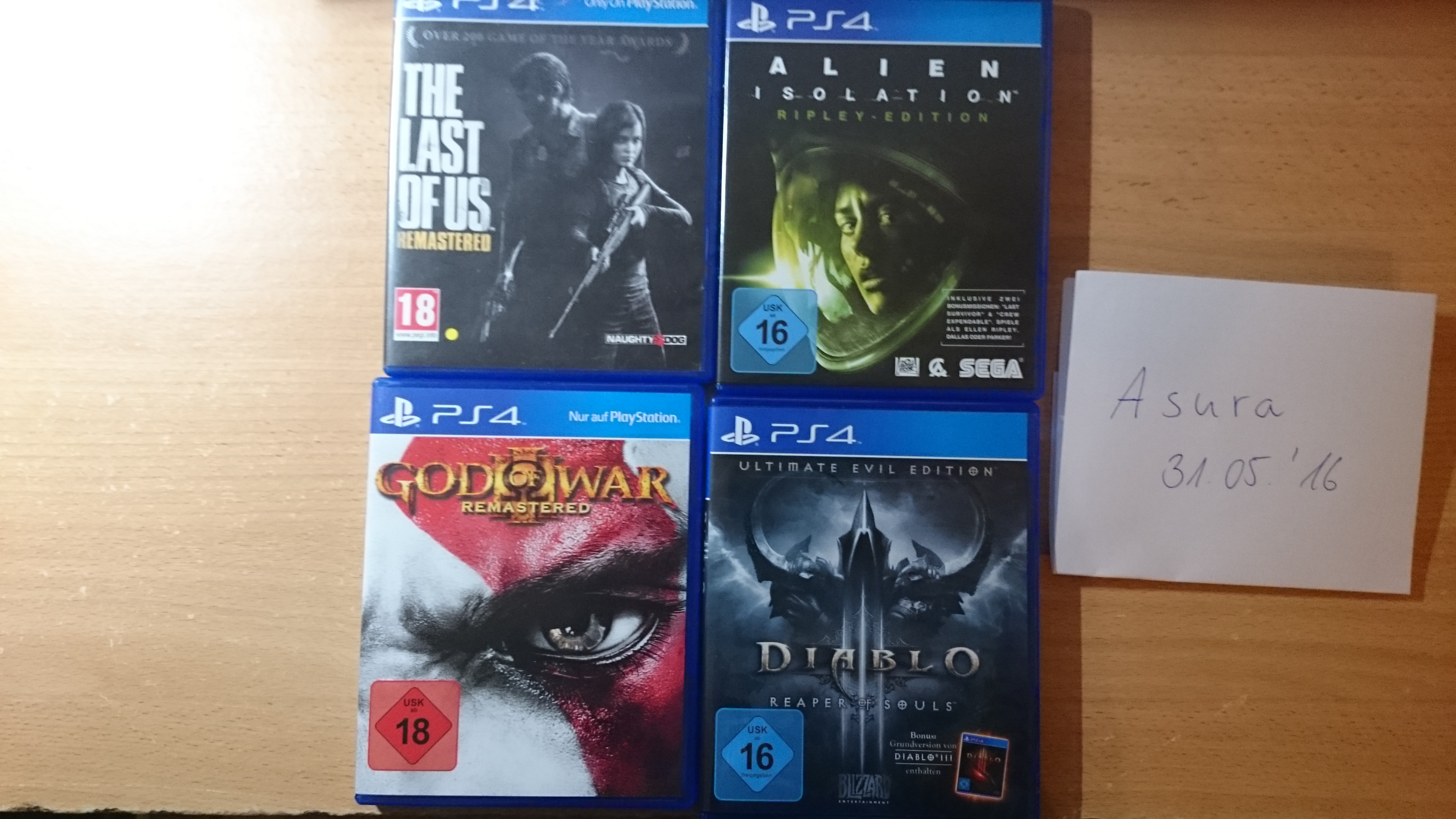 Diskutiere PS4 Games [The Last of Us; Alien Isolation; God of War III; Diablo III] im Spiele, Konsolen und Zubehör Forum im Bereich Marktplatz; Biete euch die folgenden Games zum Verkauf oder auch Tausch an: